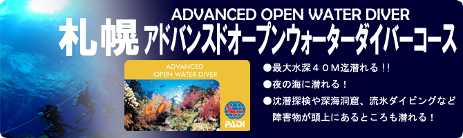このコースは、学科・プール講習がなく海に5回潜るだけでOK。とっても簡単に取得できるコースです。 週末などを利用して、最短で3日間あればいいんです☆ 海に遊びに行く感覚で取得できます☆ オープンウォーターダイバーのステップアップコースとして多くの方がこちらのコースを受講されます。 みなさんがオープンウォーターダイバーになったとき、「魚が見たい!」や「深いところに行ってみたい」 などなど、感じたことは様々だと思います! このアドバンスコースでは、5種類のダイビングを楽しみ 今後のダイビングスタイルを見つけるためのコースとも言えます。